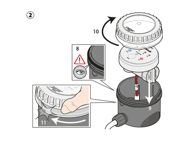 Um vollständige Dichtheit (IP68) zu gewährleisten, schrauben Sie den transparenten Deckel vollständig fest, bis er anschlägt, und stellen Sie sicher, dass die Dichtung korrekt sitzt ②.