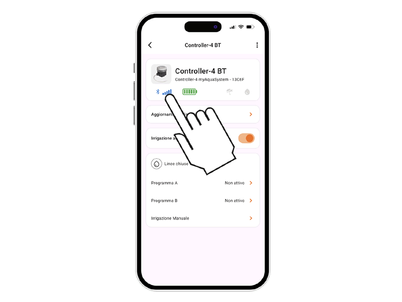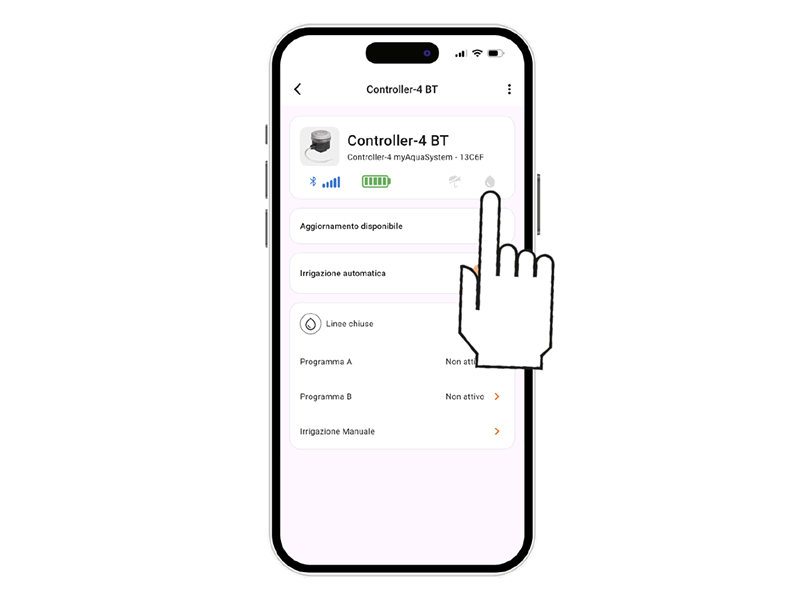 Um die manuelle Bewässerung am Controller zu aktivieren, drücken Sie die Controller4-BT-Taste mehrmals, bis die LED in der Farbe der zu öffnenden Leitung blinkt: Leitung 1 GRÜN, Leitung 2 GELB, Leitung 3 ORANGE, Leitung 4 VIOLETT.
