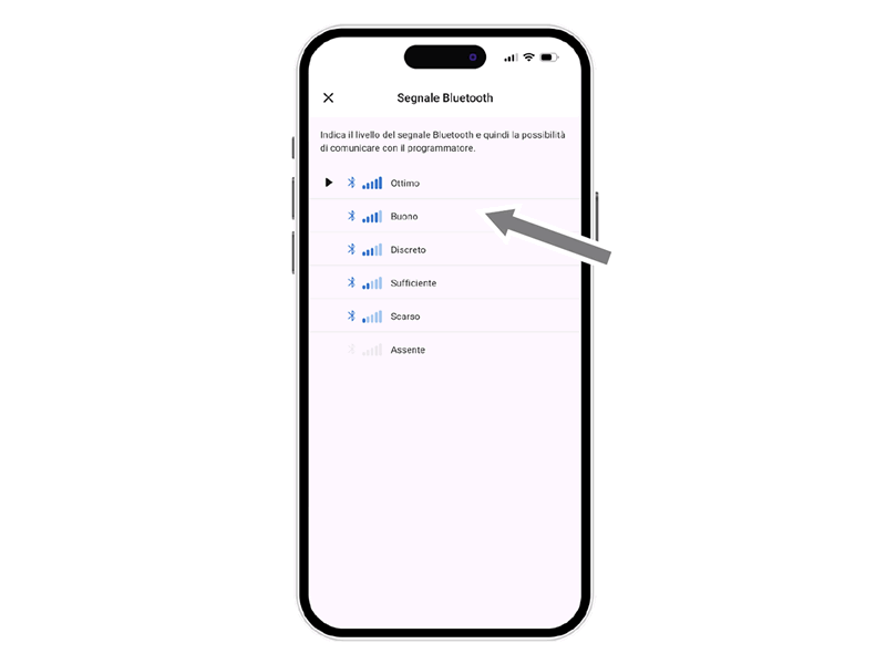 Das Symbol für das Bluetooth®-Signal zeigt an, ob der Programmierer erreichbar ist (blau) oder nicht (grau). In diesem Fall muss man sich mit dem Smartphone nähern.