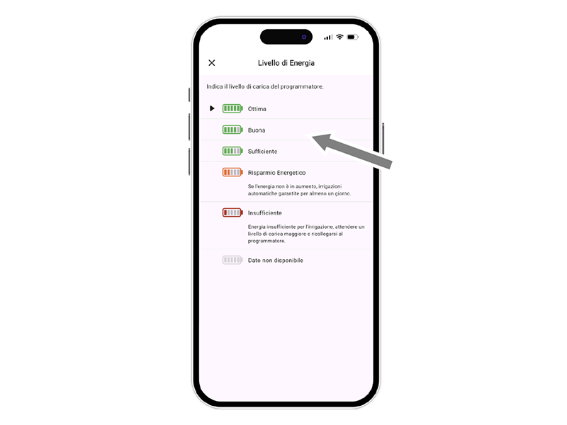 Bei niedrigem Energiestand Batterien sofort ersetzen. Es gibt 5 Stufen. Im Sparmodus (gelb) ist noch 1 Tag Bewässerung möglich. Bei roter Anzeige werden Funktionen deaktiviert, Datum/Uhrzeit bleiben 16 h gespeichert.