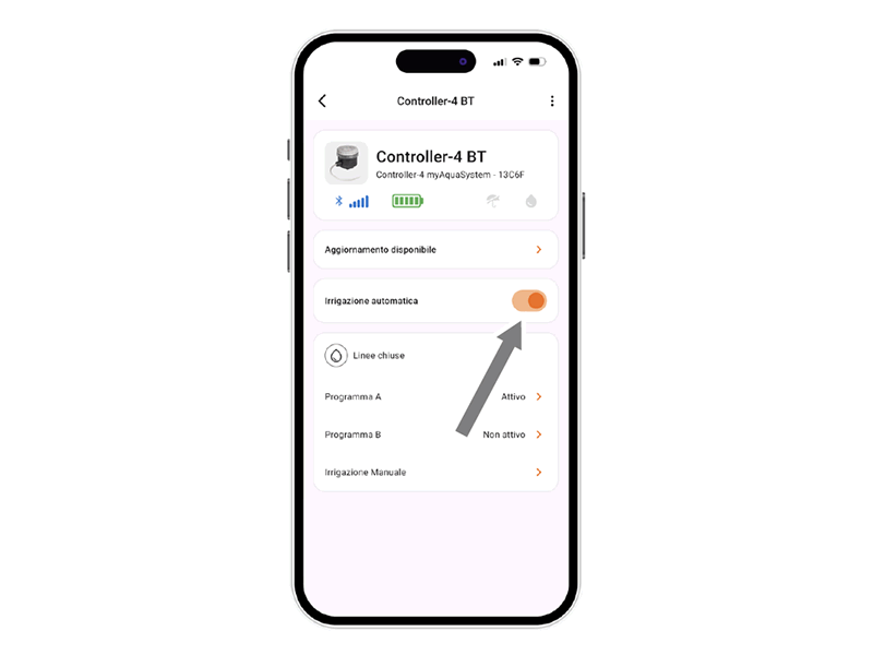 Damit programmierte Bewässerungen stattfinden, stellen Sie sicher, dass auch der Schalter für automatische Bewässerung auf AKTIV steht.