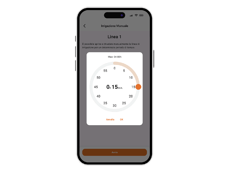 Drehen Sie die Minutenzahlen, bis die gewünschte Dauer erreicht ist, und bestätigen Sie. Die Bewässerung ist von 1 Minute bis 4 Stunden einstellbar.