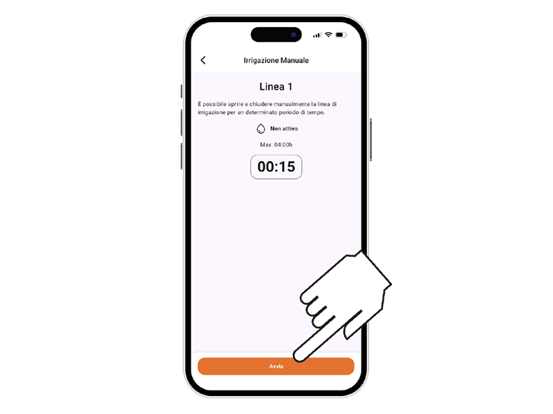 Wählen Sie die gewünschte Bewässerungslinie und stellen Sie die Dauer ein, indem Sie auf Stunden/Minuten drücken.