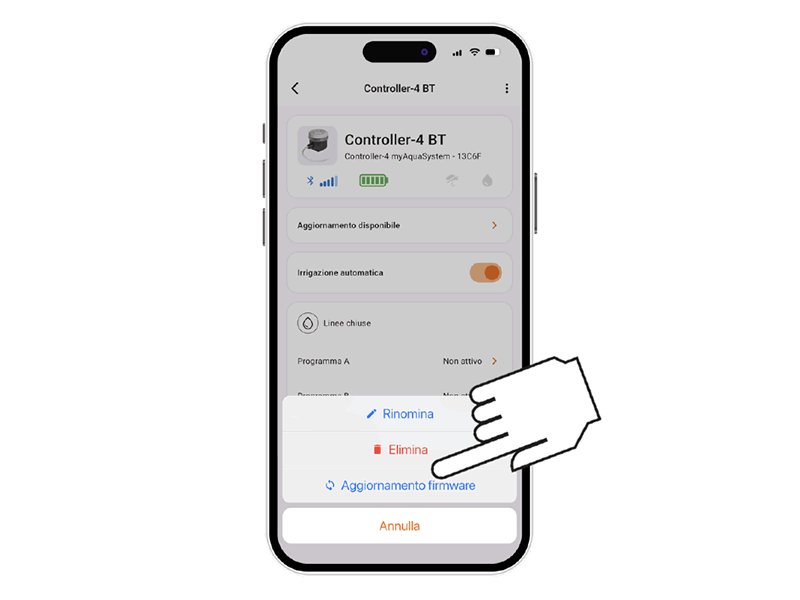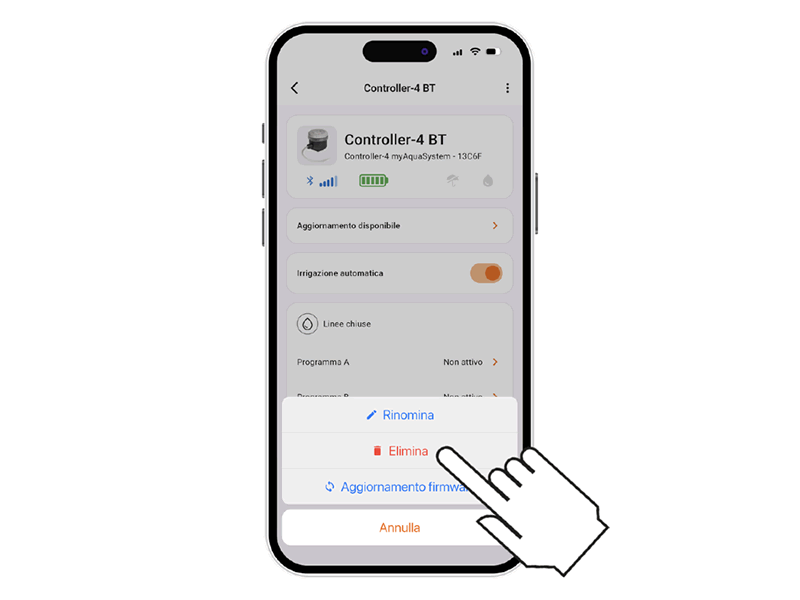 Ein aus der App gelöschter Programmierer führt weiterhin die programmierten automatischen Bewässerungen aus, erscheint jedoch nicht mehr auf dem Hauptbildschirm. Um nur die automatische Bewässerung zu stoppen, verwenden Sie den Schalter Automatische Bewässerung.