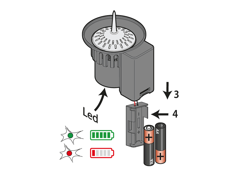 Wenn die LED rot blinkt, sind die Batterien fast leer: ersetzen Sie sie baldmöglichst.