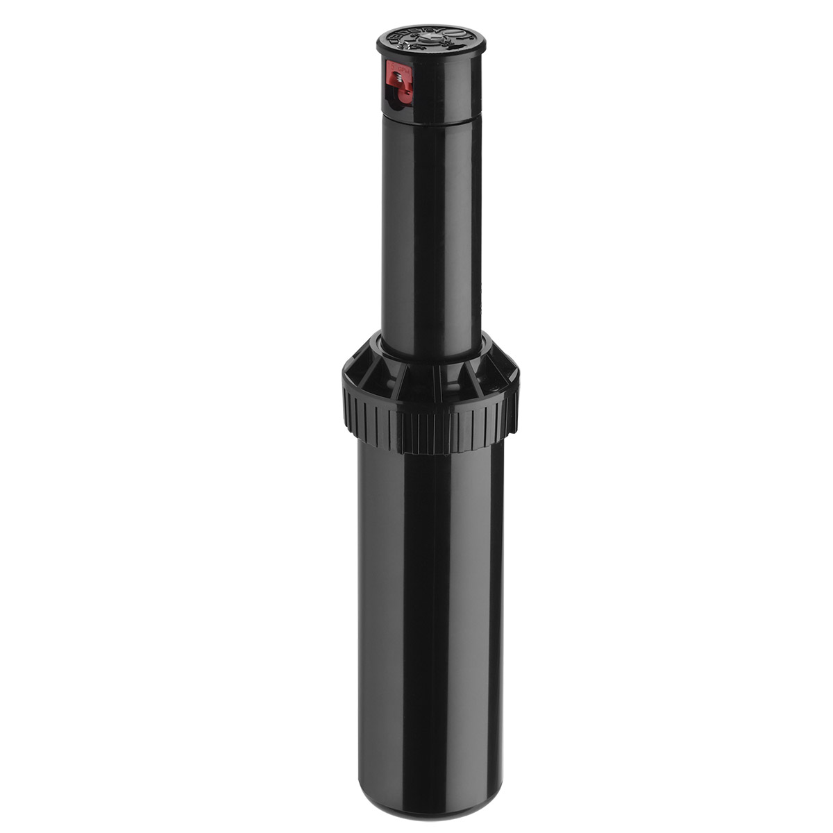 Turbinenregner mit mittlerer Wurfweite und austauschbaren Düsen. Regulierbarer Wurfbogen zwischen 40° und 360° mithilfe eines einfachen Schraubendrehers, eine Markierung auf der Abdeckung zeigt den gewählten Wurfbogen. Der Regner kann vor der Installation und nach der Installation entweder in der statischen Position oder während des Betriebs eingestellt werden; ein spezieller Mechanismus verhindert Schäden am Getriebe während der Einstellung. Herausnehmbarer interner Filter. Betriebsdruck von 1,5 bis 4 bar. Radius von 4 bis 9 m. Gewindesockel 1/2”. Erhöhung um 4” (10 cm). Max. beregnete Fläche 254 m².