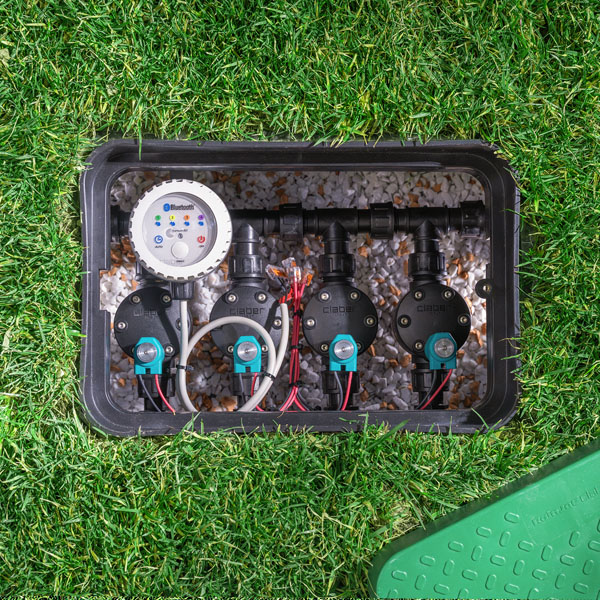 Bewässerungscomputer und 4 Magnetventile in einem einzigen einsatzbereiten, batteriebetriebenen Ventilschacht. Ideal für Do-it-Yourself-Anlagen in Gärten mittlerer Größe (bis zu 600 m2).