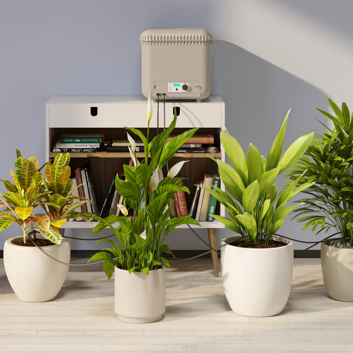 Vollkommen autonomer und platzsparender Wasserverteiler, der in wenigen Minuten einsatzbereit ist. Muss weder an einen Wasserhahn noch an eine Steckdose angeschlossen werden. Oasis fasst 25 Liter Wasser und bewässert bis zu 20 Topfpflanzen ohne Verschwendung. Vier verschiedene Programme (7-14-21-28 Tage Autonomie), wählbar mit einem praktischen Drehgriff. „Start “-Taste für den Sofortstart des Programms oder eine Verzögerung des Programmstarts um bis zu 23 Stunden. Das LCD-Display mit Hintergrundbeleuchtung gestattet die Anzeige des gewählten Programms, die Dauer des laufenden Bewässerungszyklus, die eventuell eingestellte Startverzögerung und die noch verbleibende Zeit bis zur nächsten Bewässerung. Kompaktes, elegantes und bis ins kleinste Detail durchdachtes Design. Funktioniert mit 2 aufladbaren Mignon-AA-Batterien von 1,5 V (nicht mitgeliefert). Im Set enthalten sind ein 10 Meter langer PE-Verteilerrohr, 20 Tropfer und 20 Schlauchhalter.
