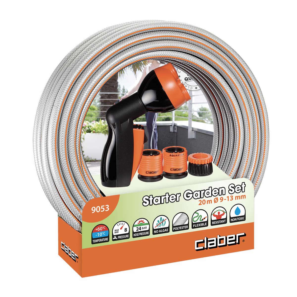 Das Kit umfasst: 20 m Schlauch 9-13 mm, Hahnstück 3/4” mit Reduzierstück 1/2”, 1 automatische Kupplung 9-13 mm, 1 automatische Kupplung mit Aquastop 9-13 mm, 1 Multifunktionspistole. Rollen mit Schutzfolie.
