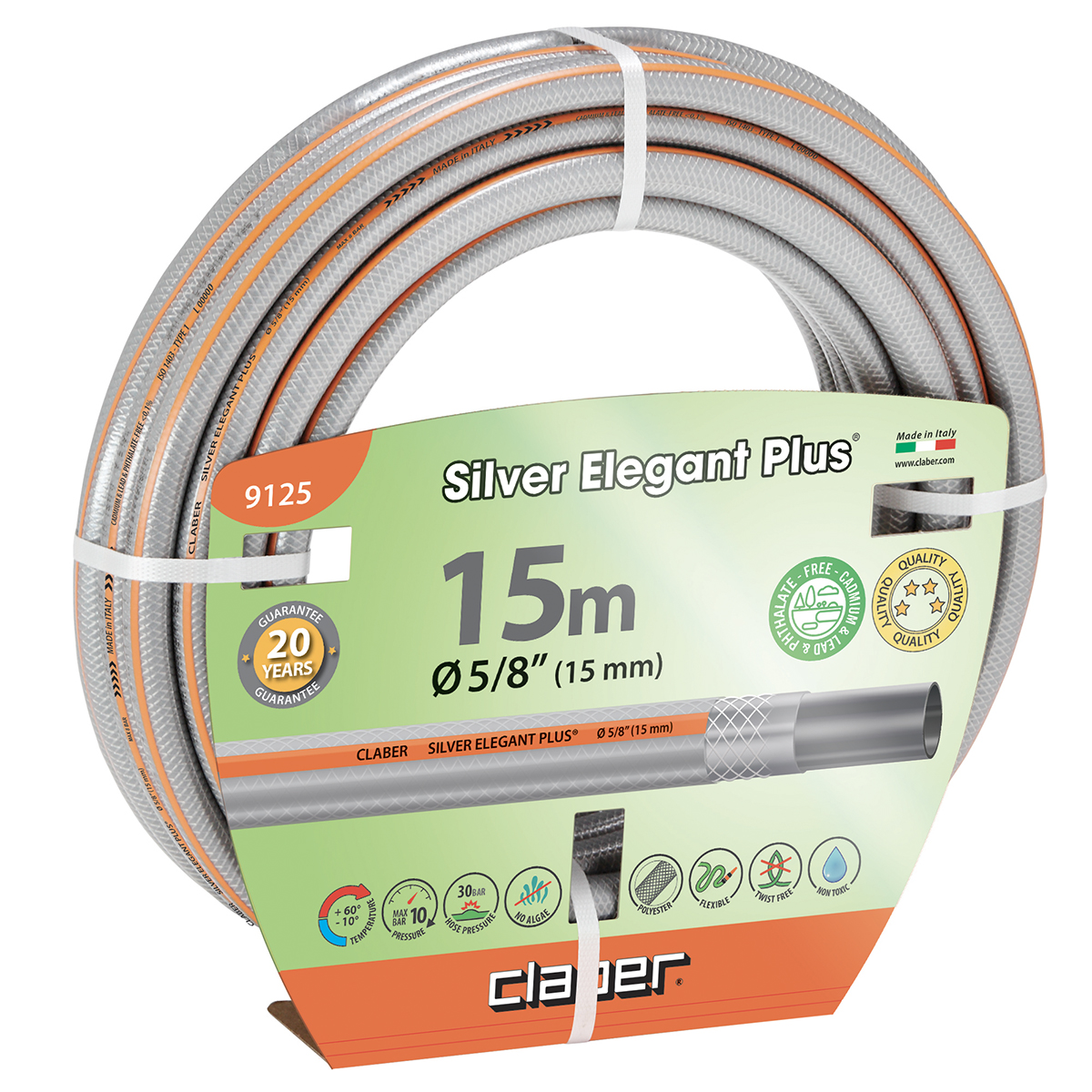Besonders leichter und handlicher Kreuzgewebeschlauch, biegsam, beständig gegen Algen und UV-Strahlen. Die Schläuche Silver Elegant Plus sind frei von Schwermetallen und Phthalaten und somit zu 100 % sicher.