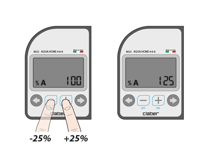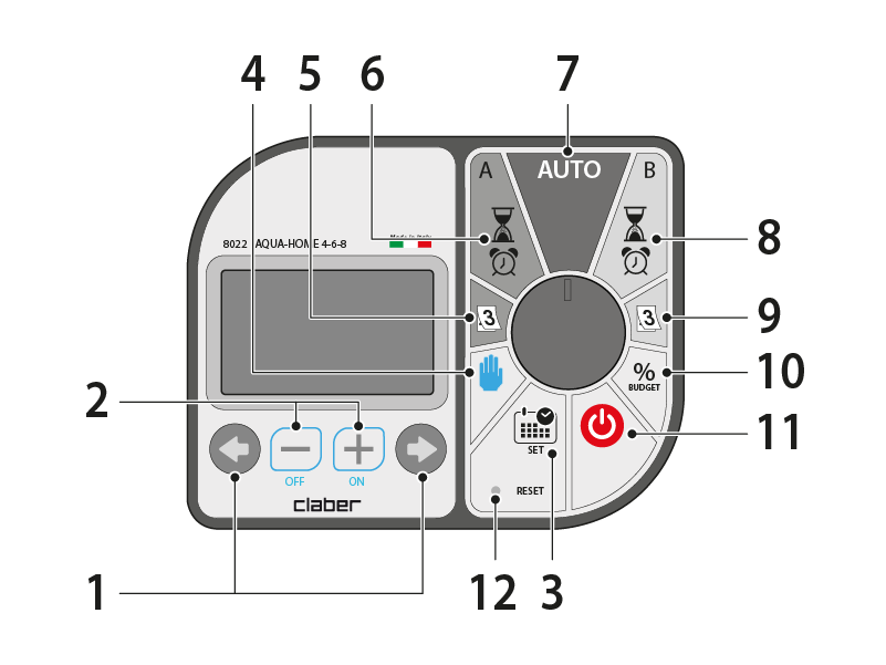 To increase or decrease the times, use the - and + buttons: each press varies the value in increments of 25%. To temporarily exclude programme A/B or both programmes, set the BUDGET of that programme to OFF.