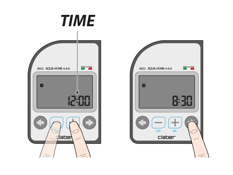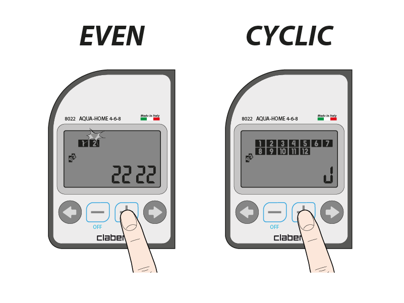programming on even days; cyclical programming. Change the values using the - and + buttons. Use the right arrow to return to the page for the time and the day of the week.