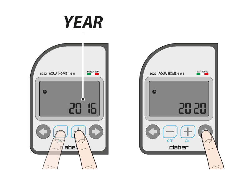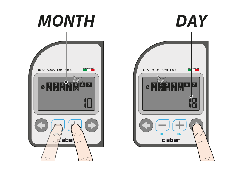 The current date is set on the first three programming pages: the time, the month and day and the year. Change the values shown using the - and + buttons. Use the arrows to scroll through the pages.