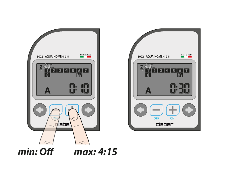 The run time can be set from 1 minute to 4 hours and 15 minutes using the - and + buttons. Every valve is pre-set to a default opening time of 10 minutes. If you don’t want to use a valve, press the - button until you reach OFF.