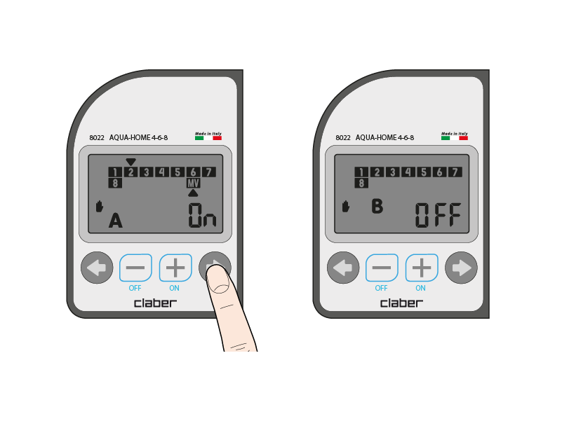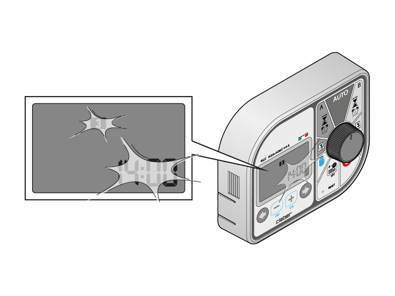 By pressing the + button an additional irrigation session is activated, with the run time previously set (for both programme A and programme B, opening all the valves in sequence). By pressing the + button again you move on manually to the next valve. The - button closes the valve.