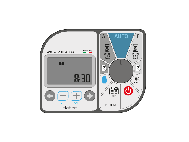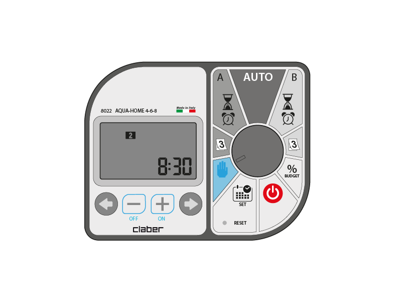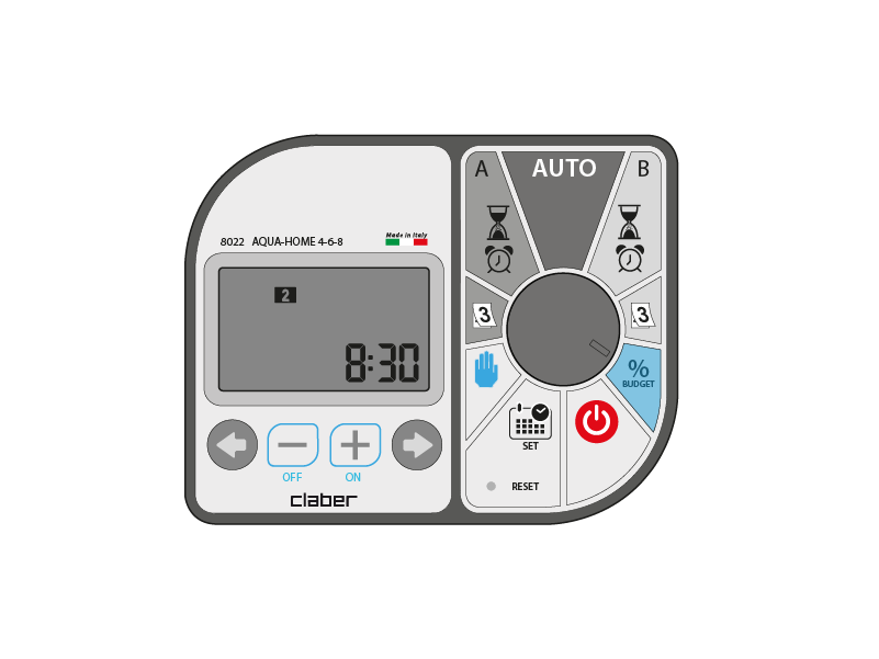 Budget changes the programmed irrigation times (from OFF to 200%), for both programme A and programme B.