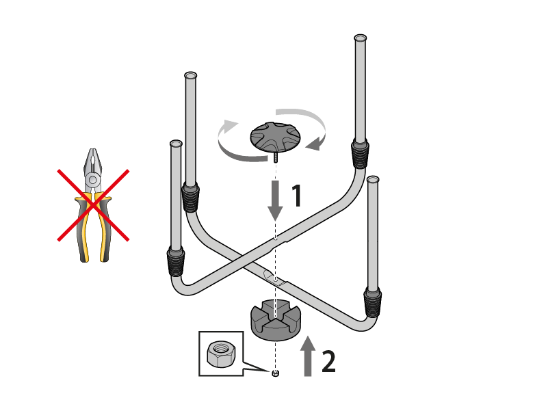 Cross the two base legs and fix them in place by threading the cap into the foot through the hole in the legs and tightening using the nut supplied.
