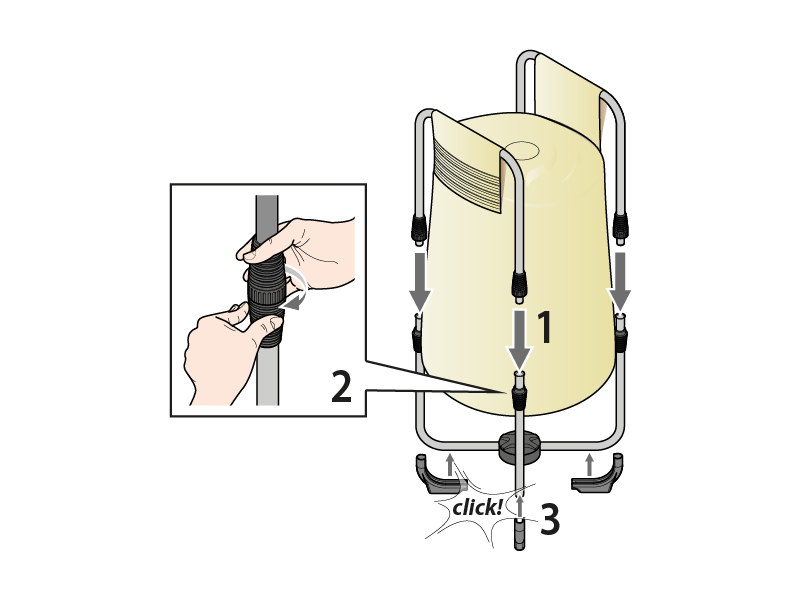 Attach the handles to the base legs and fix by tightening the couplings. Attach the floor stands to the base legs.