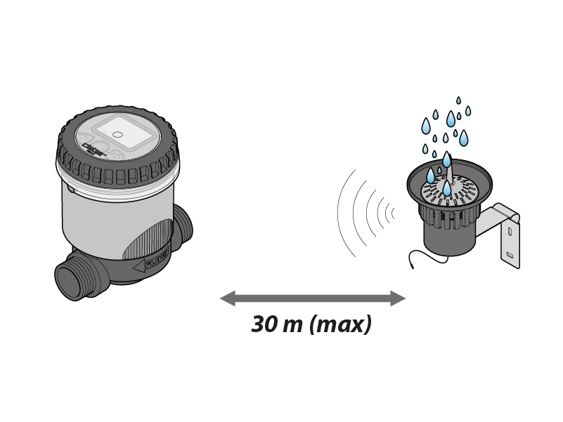 The RF solenoid valve recognises the signal of an installed RF Rain Sensor, provided the devices are no more than 30 m away (obstacle free) and there are no other radio frequency signals.