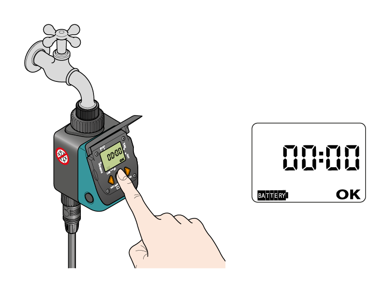 As soon as the battery is connected, the display switches on, the valve runs a test cycle and the timer is set to 00:00.