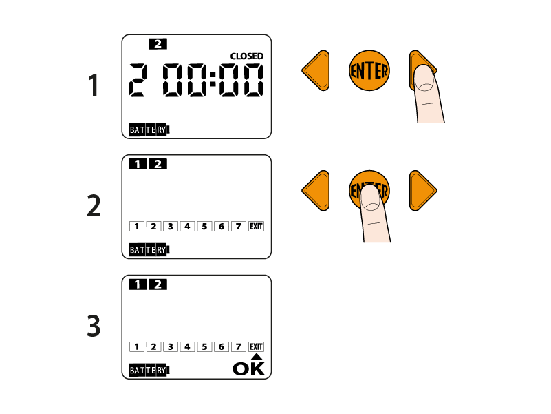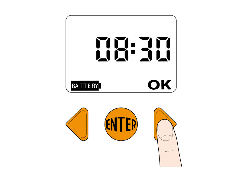 You will see “OK” on the screen, meaning the opening time can be set using the arrows (e.g. 05:00). You will see a 1 (for programme 1) at the top of the screen. Confirm the time by pressing ENTER.