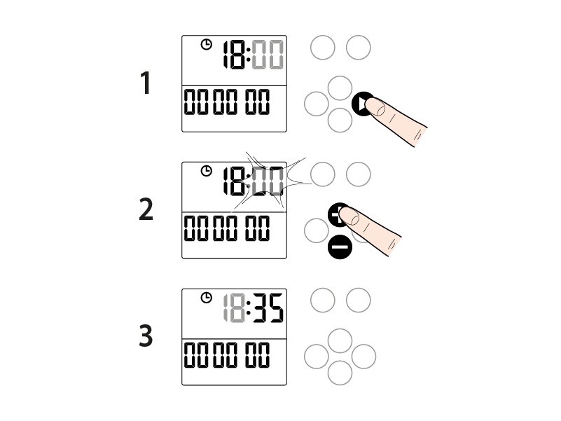 HOUR setting. Press the right arrow key to access the HOUR setting (the number flashes to indicate that a value needs to be entered). Press the + and - keys to set the value (in the example, 18:00).