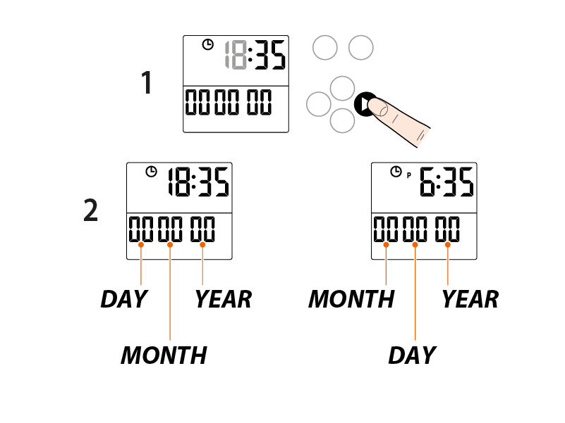 DATE setting. Press the right arrow key to access the DATE, if you have chosen the 24-hour clock, the values will be displayed in the format day-month-year; if you have chosen the 12-hour clock, the values will be displayed in the format month-day-year.