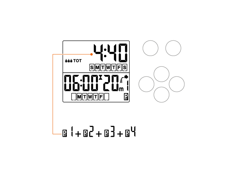 Set all subsequent programmes in the same way. The top display shows the total of all the watering RUN TIMES for the programmes set for the week (e.g. 4 hour and 40 minutes).