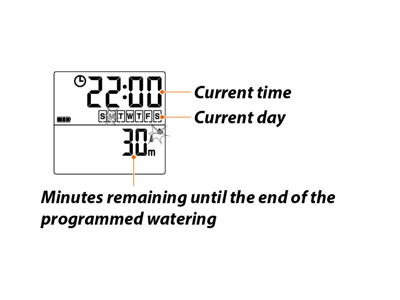 Watering in progress page. When programmed watering starts (for example, at 22:00), the display shows: the current day and time at the top, the remaining minutes at the bottom, the flashing watering-can symbol. When watering has finished, the time page will once again appear on the display.