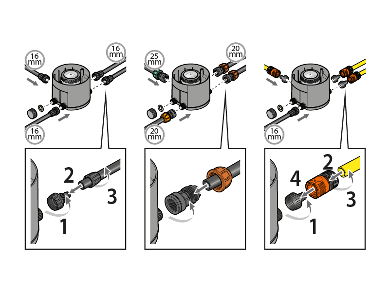 Once the valve box has been positioned, make the hydraulic connections as indicated on the following pages: depending on individual requirements, it is possible to connect the valve box with pipes of different diameters using the specific fittings (not supplied). Below each link is referred to the example above.