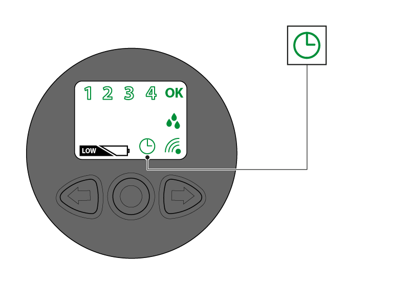 Situation: Paired, time NOT synchronised between the two devices (for example, because the time has been lost due to a prolonged period without batteries). the irrigation programmes will be run at different times to those set on the RF remote control.
