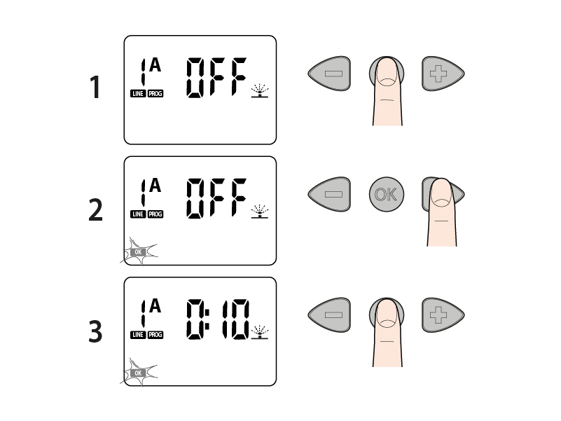 Press OK to access the screen where you can enter the LINE 1 irrigation run time (the OK symbol flashes); use the arrows to set the irrigation run time in minutes (e.g. 10 minutes). The watering cycle run time for each line can be set from 1 to 60 minutes. OFF: no irrigation. Press OK to confirm the time entered.