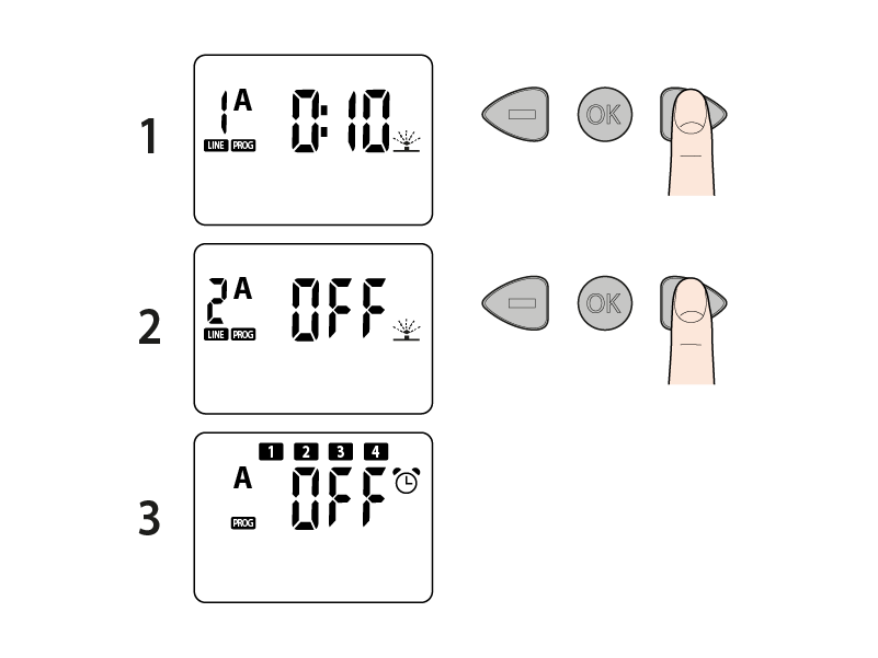 OFF: no programmed starts. Enter times in sequence, within a 24-hour timeframe. At each set start time, all the lines will open in succession, each for the run time set, until the cycle is complete.