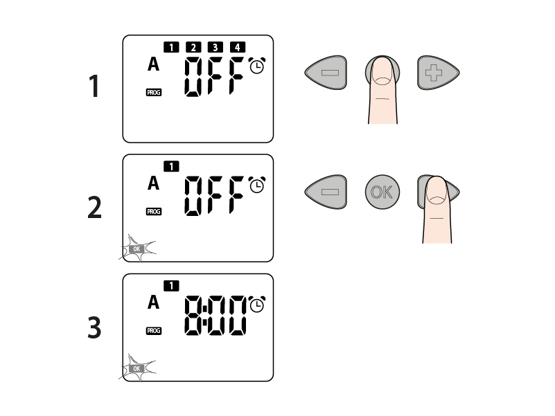 Press OK to confirm the time entered. Press the right arrow to display the next programming page. Set the other start times in the same way.
