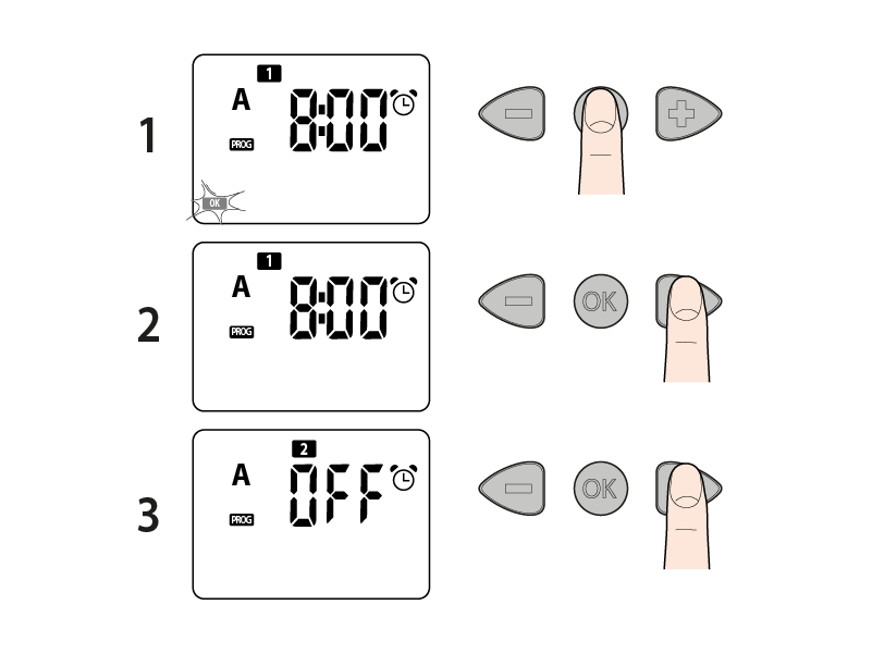 To set start 1 press OK, the 1 symbol is fixed. Use the arrows to enter the start time for irrigation 1 (i.e. 8:00) with the use of the arrrow buttons (scrolling is faster when holding down the buttons).