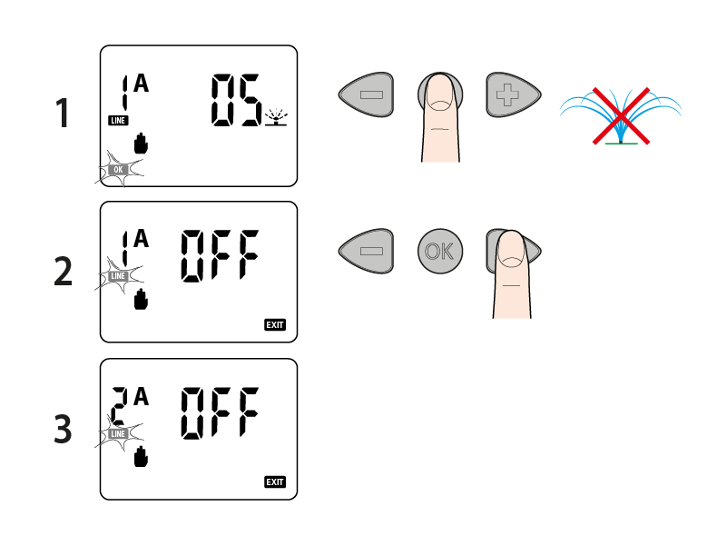 Press OK a second time to stop watering before the end of the preset time. To open the valves on the other line, press the right arrow and repeat the steps described above.