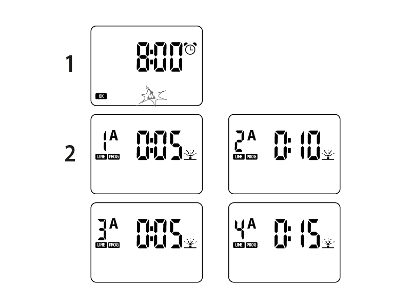 Set the first start time, for example 8 am. If you set a second start time, it will be displayed automatically at 1 minute after the sum of the run times for all lines, i.e. 8.36.