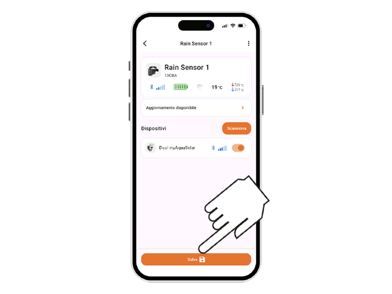 The Bluetooth® rain sensor automatically interrupts the irrigation program when it rains and resumes it, at the set time, when the weather improves. It communicates with the controllers Tempo myAquaSolar (code 8497), Dual myAquaSolar (code 8498), Hydro4 BT (code 90840), Elettra BT (code 90843) and Controller4 BT (code 90842).