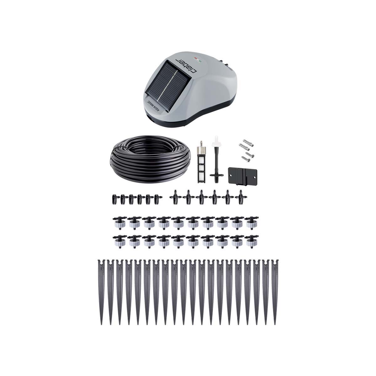 Independent ready-to-use drip kit. It includes timer, photovoltaic panel and built-in pump to draw water from a tank, filter and deliver it to 20 drippers. Inspectable filter for easy cleaning. The photovoltaic panel absorbs the light energy and turns it into electrical energy which is accumulated in 2 rechargeable AA 1.2V NiMH 1800mAh batteries (not included). A specific led reports the battery level. 54 possible irrigation solutions, which can be set with just 2 rotating knobs: one with the frequencies (between 1 and 7 days), the other with the amount of water that you wish to deliver with each dripper (between 40ml and 200ml). Optional manual irrigation: 100ml per dripper (the programme remains stored). It can be used with any tank. The kit contains: 1 solar timer-pump, 1 anti-siphon flow blocking valve at the end of irrigation, 1/4” suction filter, 1 bracket with screws and plugs for wall-mounting, 20 self-regulating drippers, 20m of 1/4” (4-6 mm) feeding tube, 20 1/4” support stakes, 5 1/4” 3-way couplings, 6 hole plugs.