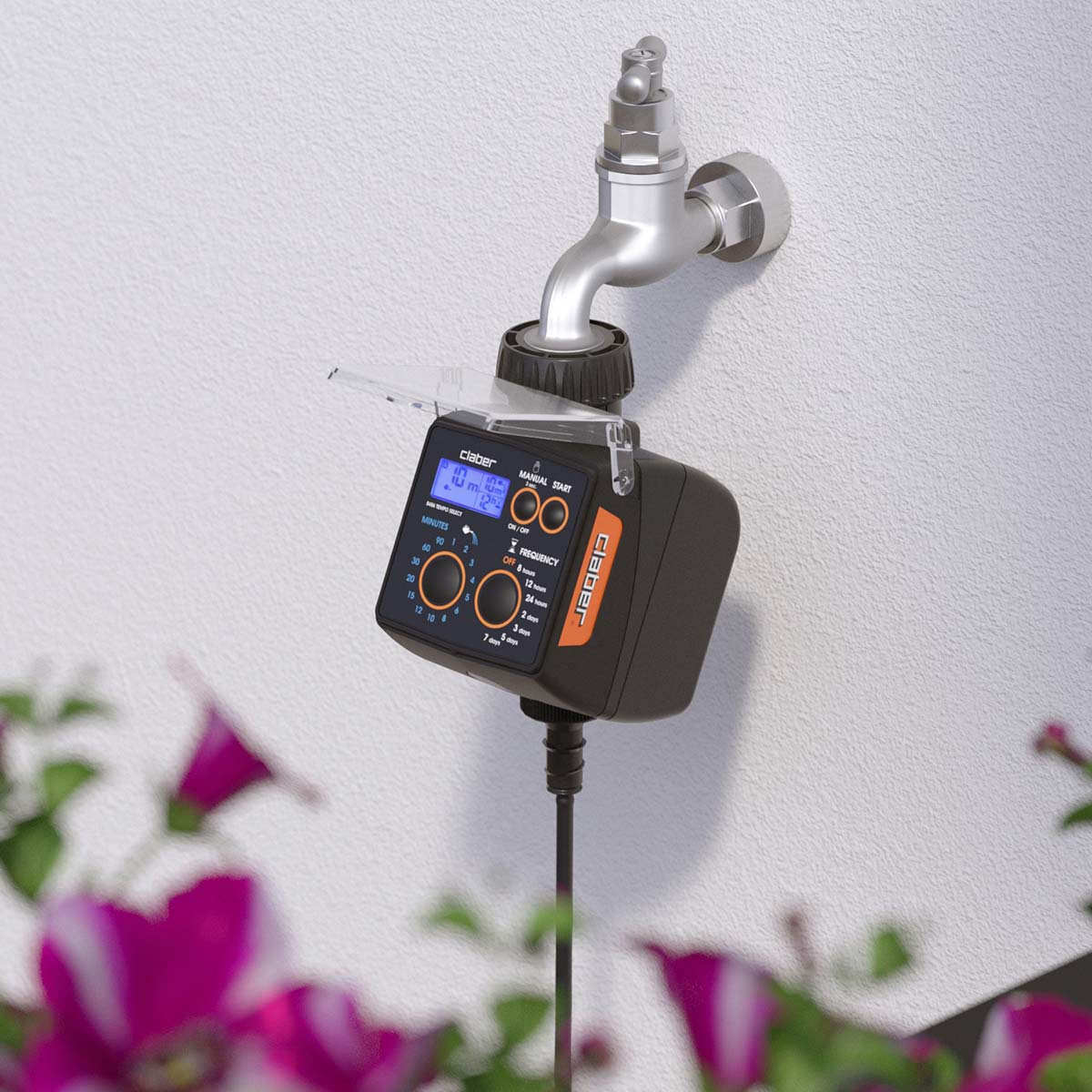 One-way automatic water timer. Powered by 2 x 1.5 V AA alkaline batteries, fitted in a rainproof socket. Easy programming with two digital buttons, one selecting 14 watering times, the other 7 frequencies. 98 preset programmes (+ off ). Backlit LCD screen displaying the different functions. Start button allowing immediate or delayed (up to 23 hours) start. On/off button for manual function (5-minute test). Electronic components fully insulated, no wires exposed to view. 3/4” (20-27 mm) tap connector with pivoting ring nut. Washable filter. Operating pressure 0,5 - 10 bar. Can be connected to standard Rain Sensor (90915) or to wireless RF Rain Sensor (90831) - with optional interface (8480). 100% checked and tested.