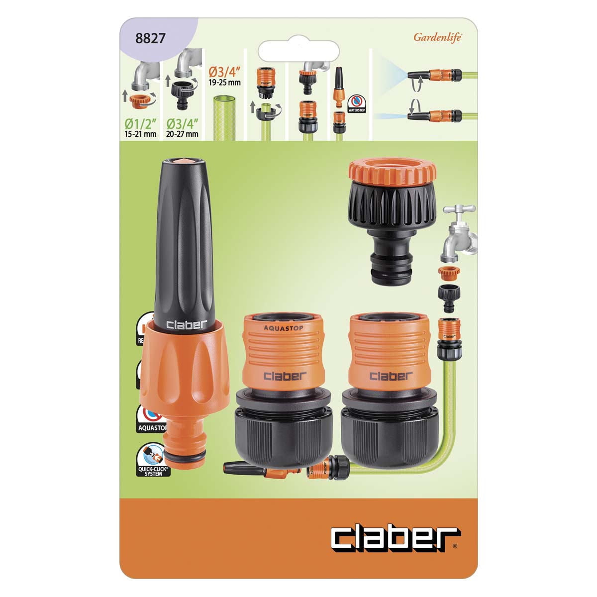 Contains: tap connector 3/4” (20-27 mm) and reducer 1/2” (15-21 mm), 3/4" automatic couplings with and without aquastop, jet spray nozzle.