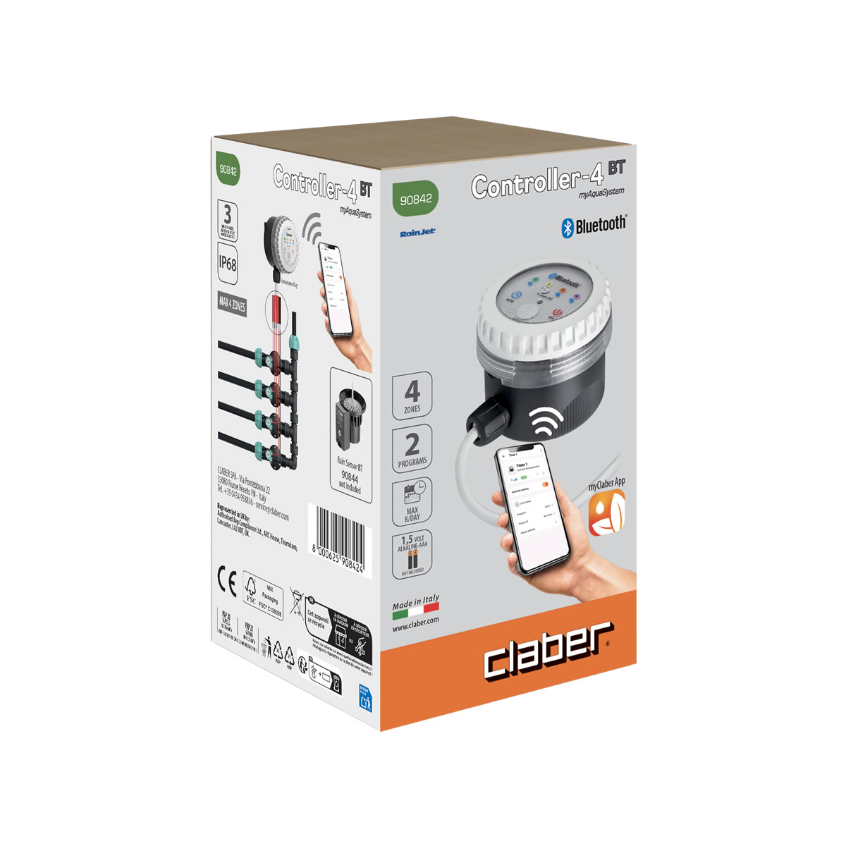 9V Bluetooth® control unit. It is fully watertight and can be stored either inside or outside the valve box. Easy to use with the myClaber app (for iOS and Android) using Bluetooth® technology. This unit controls the opening and closing of 4 x 9V bistable solenoid valves. Watering time 1 to 120 minutes. Option to run 2 programs, up to 8 watering cycles per day. Weekly programming with exclusion of specific weekdays as required. Manual function 15 minutes (can be changed up to 120 min) or possibility to activate preset programmes in manual mode. Water Budget to change watering from between 50% and 150%. Operates with 2 x AAA 1.5 V alkaline batteries. A perfectly sealed IP 68 unit. The control unit can be wall-mounted, using a special bracket, for ease of programming and practical maintenance. Can be connected to Claber rain sensor BT (90844) through Bluetooth® technology.