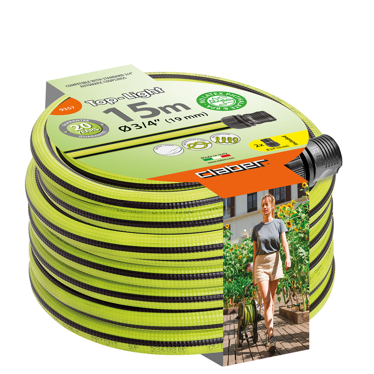 Lightweight hose, easy to handle and resistant to kinks, torsion and UV rays. Ideal to ensure an easy and convenient watering on terraces and gardens. Non-toxic (free from phthaltes, BPA and heavy metals), Top-Light is made from high quality materials and is fully recyclable. Working pressure 0-4 bar. Diameter: int. 18 mm, ext. 23 mm. Supplied with two automatic couplings, included in the pack.