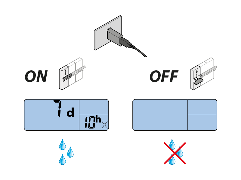 - solo con alimentación eléctrica, pero en caso de un corte de corriente, no se realizarán riegos;