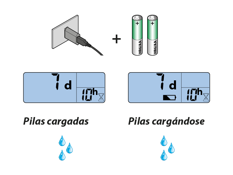 - conectado a la corriente eléctrica y con pilas recargables de 1,2 V NiMH mínimo 2400 mAh de tipo AA/HR6, garantizando así el riego aunque no se disponga de una de las fuentes de alimentación.