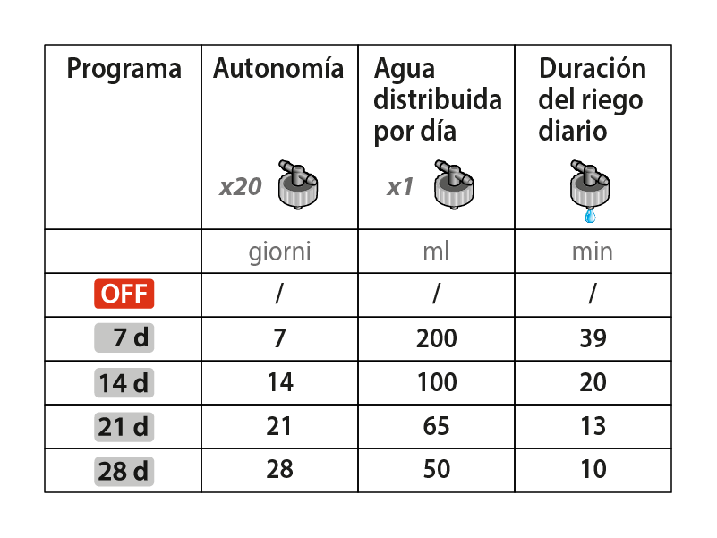Independientemente del nivel de agua contenida en el depósito, salvo que se haya agotado, Aqualux suministrará cada día la misma cantidad de agua a las macetas de acuerdo con el programa seleccionado.
