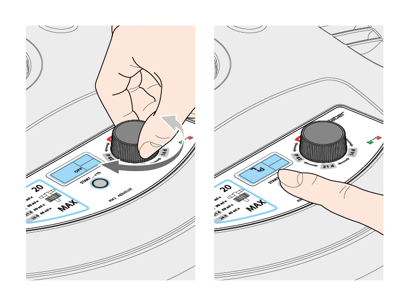 Para seleccionar el programa deseado, gire el selector desde la posición OFF hasta la posición deseada: 7, 14, 21 o 28 days (días) y pulse START.