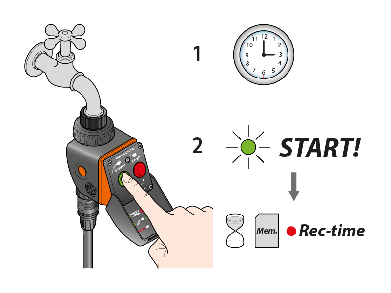 El programador realiza un solo riego cada 24 h. Importante: recuerde pulsar siempre el botón rojo. Si se olvida de pulsar STOP durante la primera programación, el programador regará durante 1 hora ese mismo día y durante solo 5 minutos los días siguientes.