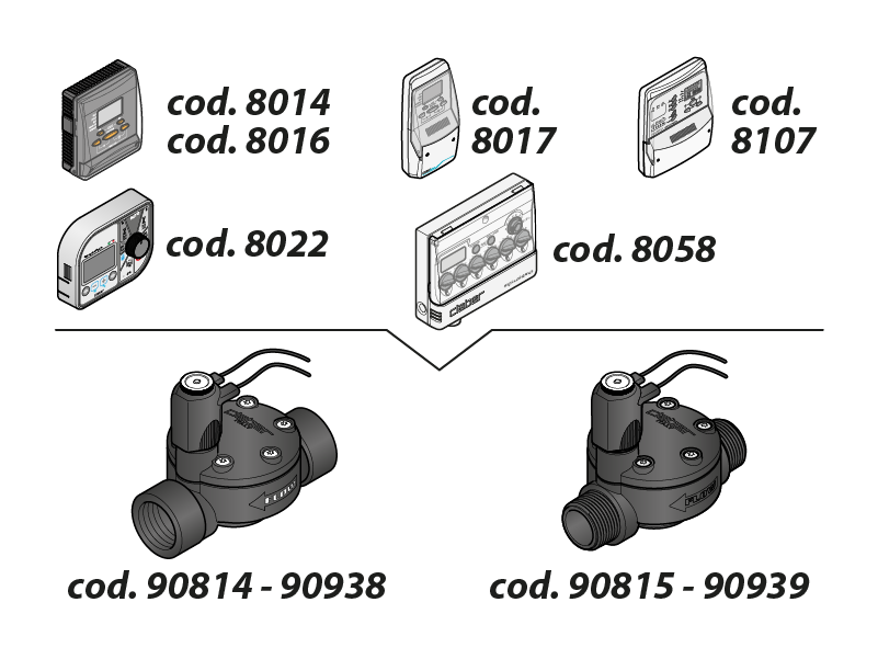 La electroválvula tiene la función de abrir y cerrar el agua de las líneas de acuerdo con las órdenes del programador. Funciona con cualquier tipo de programador multilínea de 24 V CA, es decir, con los siguientes módulos: Cometa, Cometa Evolution 24V (cód. 8014 - 8016), Meteocometa (cod. 8017), Meteopragma (cod. 8107), Aqua-Home 4-6-8 (cod. 8022) y Multipla AC 230/24V LCD (cód. 8058).
