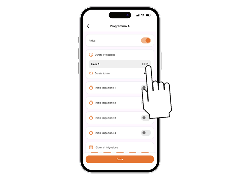 Seleccione la línea de riego deseada y establezca la duración tocando el campo de horas/minutos.